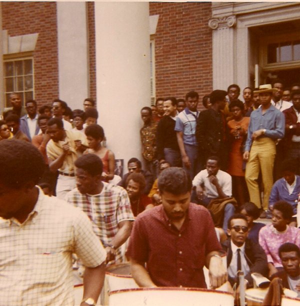 Ronald C. Emrit with the Trinidad Steelband in front of Frederick Douglass Memorial Hall, Howard University (May 1968)